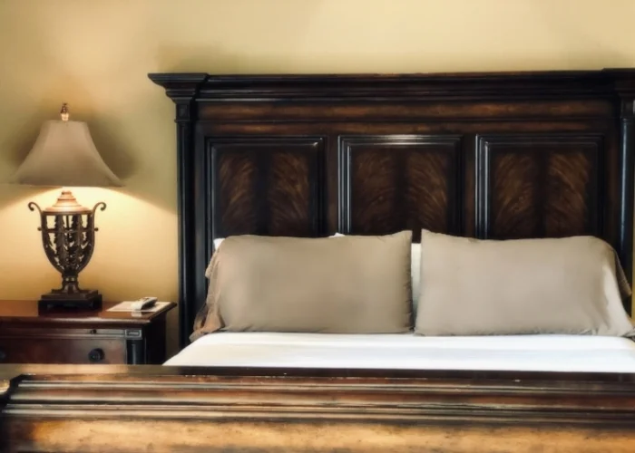 Handsomely furnished with beautiful dark wood, the rocking chair by the fireplace invites you to relax. With a plush California king bed, private balcony, fireplace, a tub with a separate double-headed shower, wet bar, TV & DVD player you are sure to get a great nights sleep in this beautiful room.
